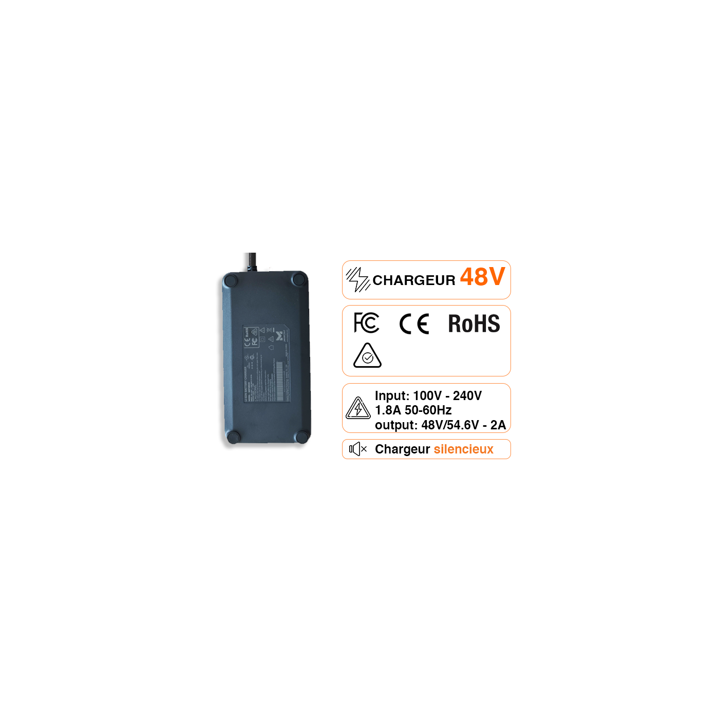 The 48V 2A charger allows you to recharge a 48V 14Ah 670Wh Lithium battery in 7 hours.