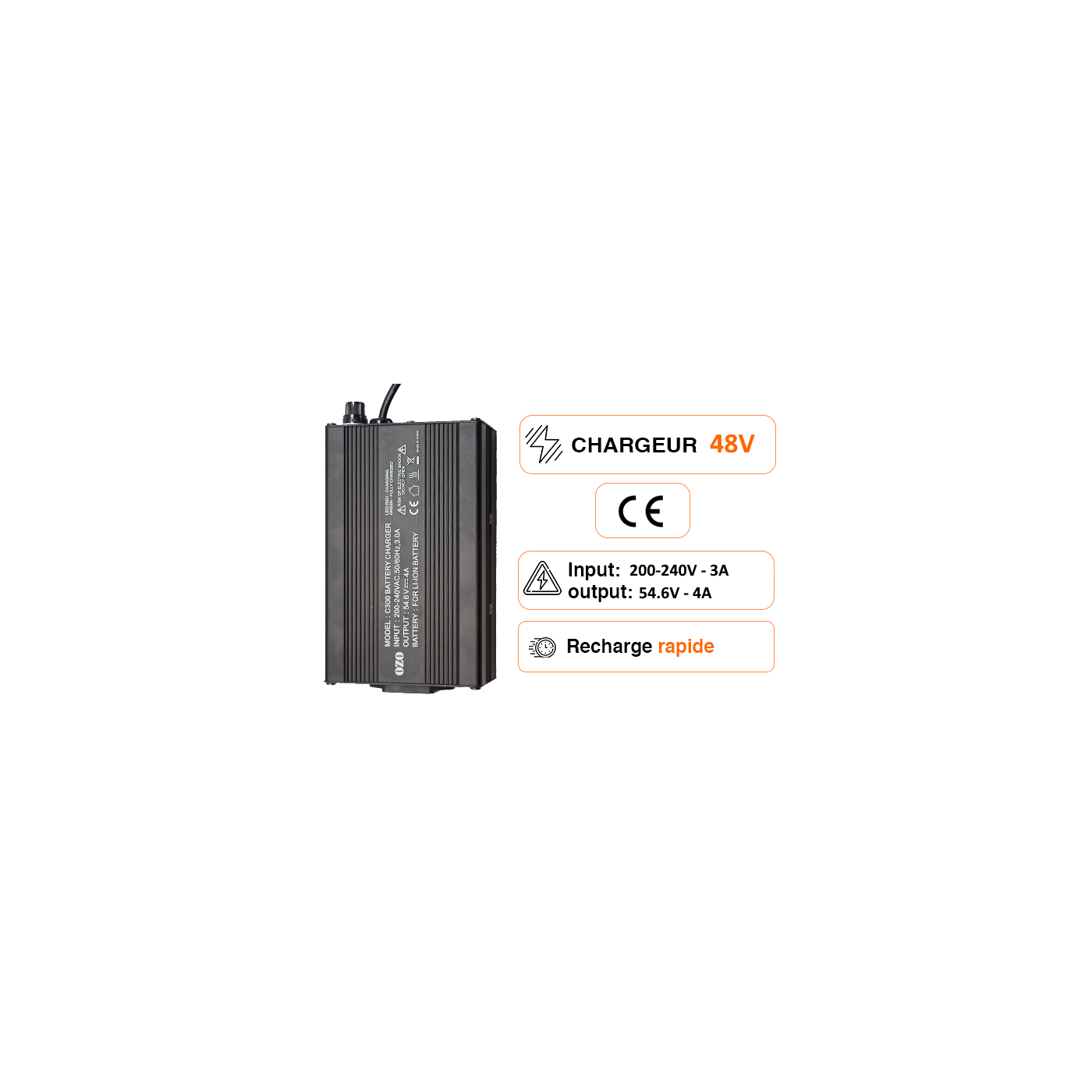 The 48V 4A charger allows you to recharge a 48V 14Ah 670Wh Lithium battery in 3 hours 30 min.