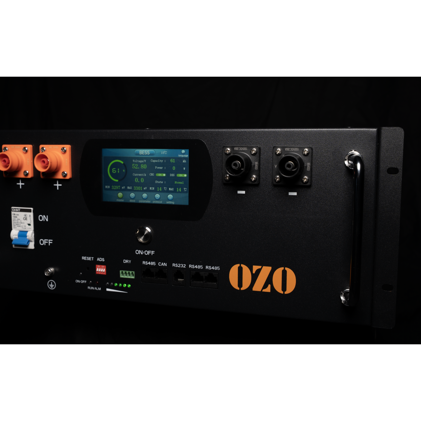 The OZO 5kWh solar battery features a front-mounted color touchscreen, providing direct and intuitive access to system settings and operating data.