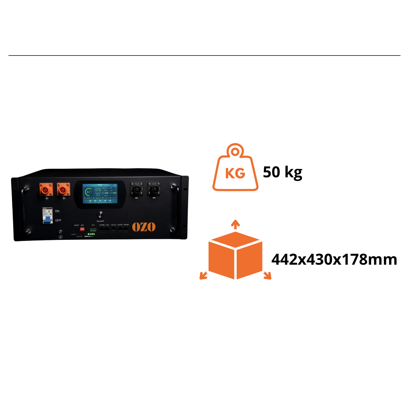 Its rack-mount format weighing only 50 kg, easy rack or wall installation, and integrated LCD screen allowing monitoring of SOC, SOH, voltage and cell temperature make it a modular and practical solution.
