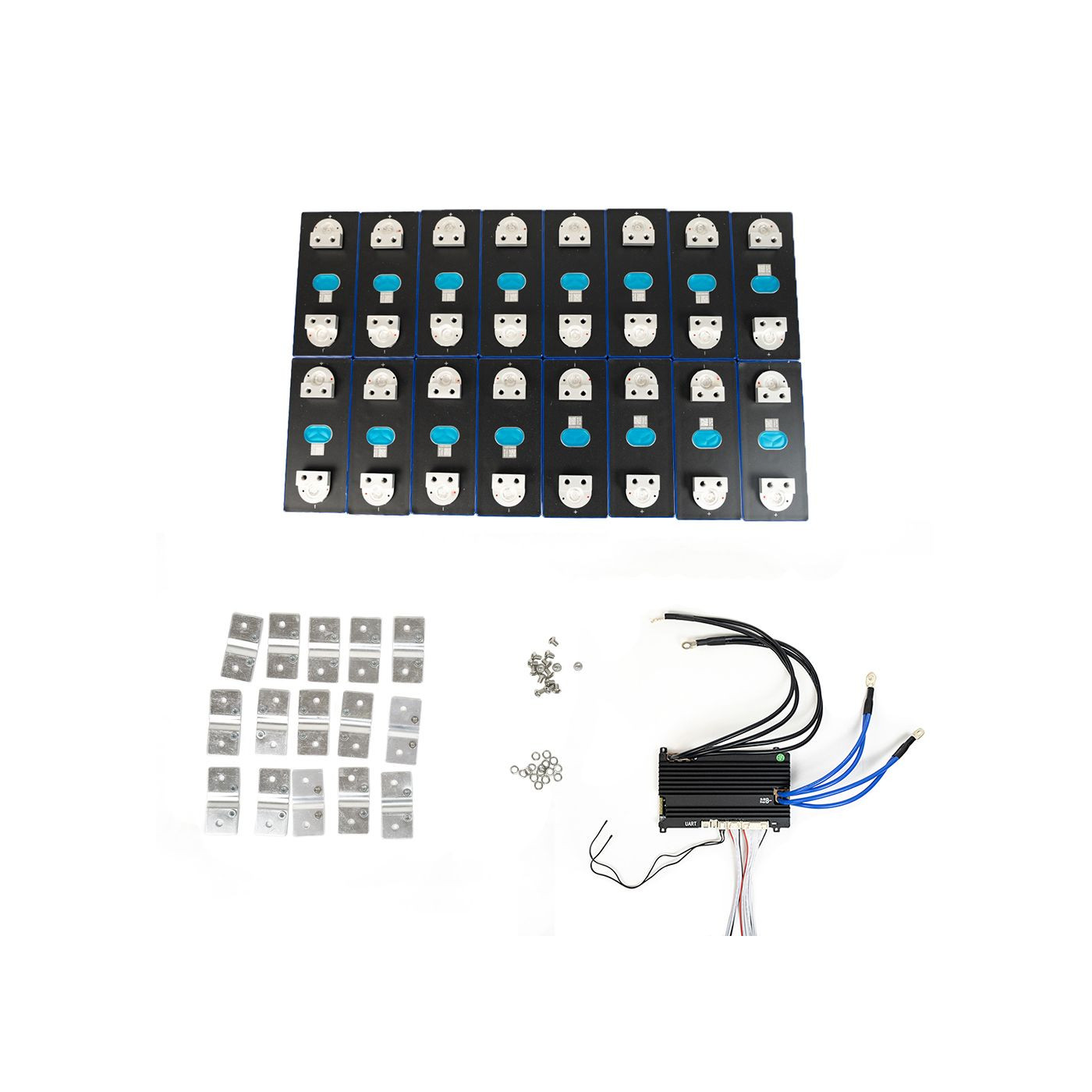 Complete set to assemble yourself a 48V 100Ah 4800Wh Lithium Iron battery with 3.2V 100Ah prismatic cells. Ideal for your boat, motorhome, van, caravan, house storage, mobile home, agricultural vehicle.