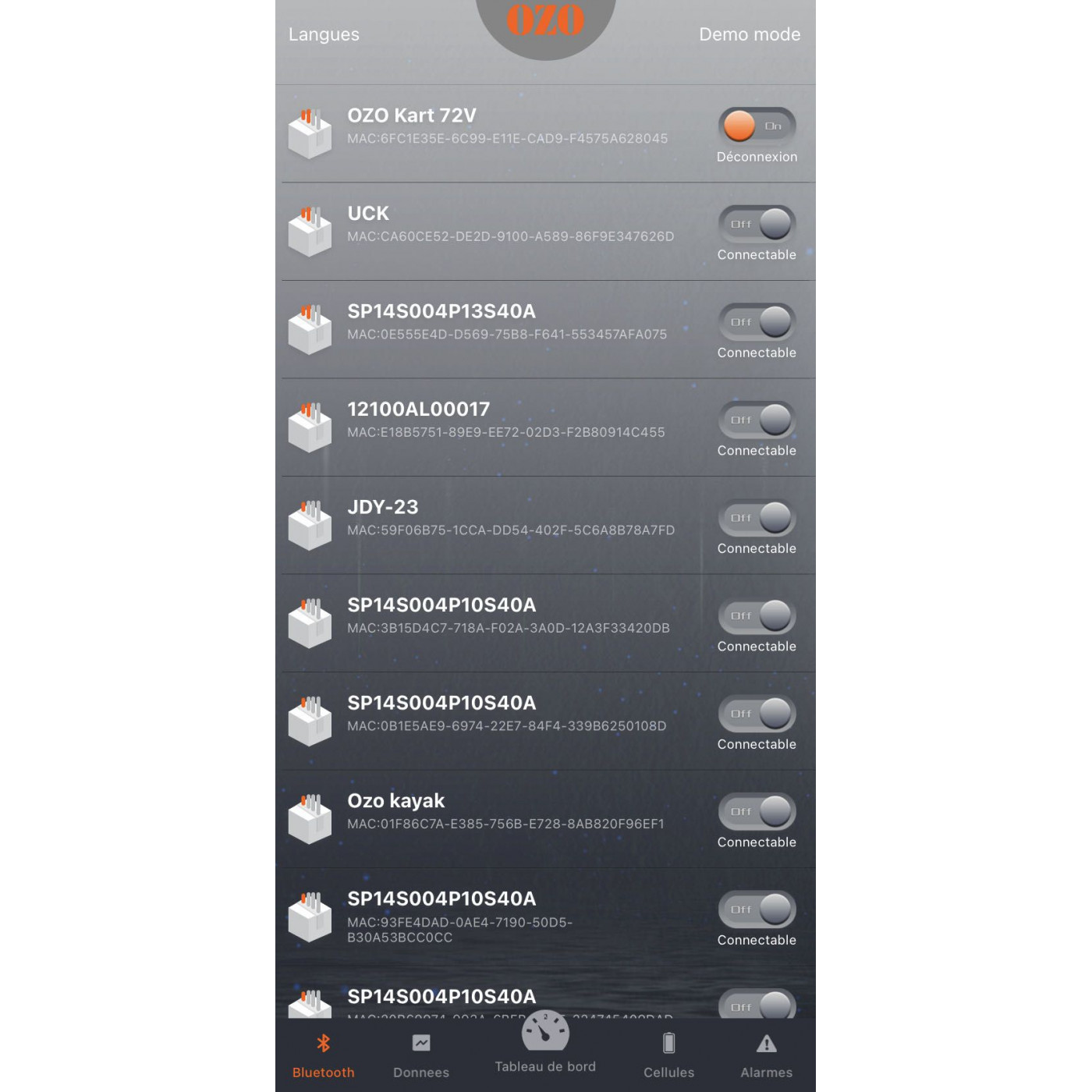 L'application OZO BATTERIES vous permet de communiquer avec le BMS de votre batterie OZO en Bluetooth afin de lire les paramètres batterie comme la puissance instantanée de décharge, le courant de charge, l'état de charge de la batterie, la tension de la batterie, la tension de chaque cellule, la température, le nombre de cycles d'utilisation…