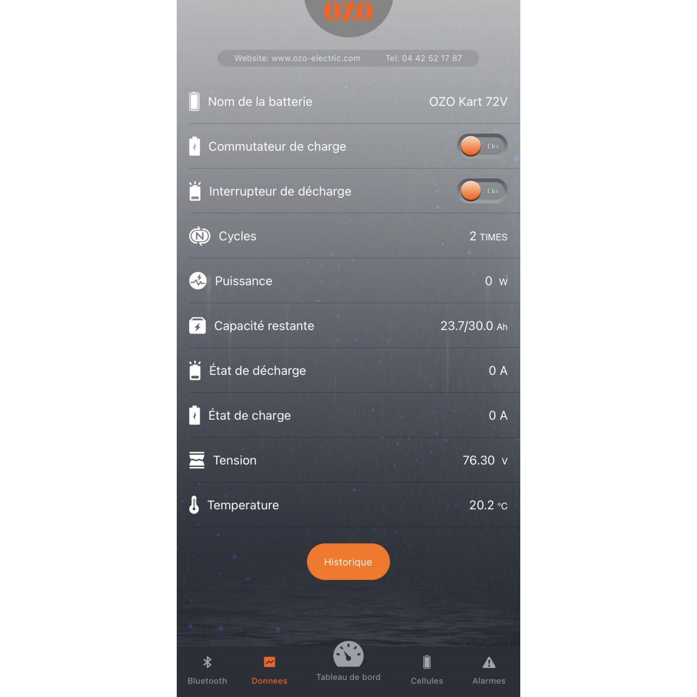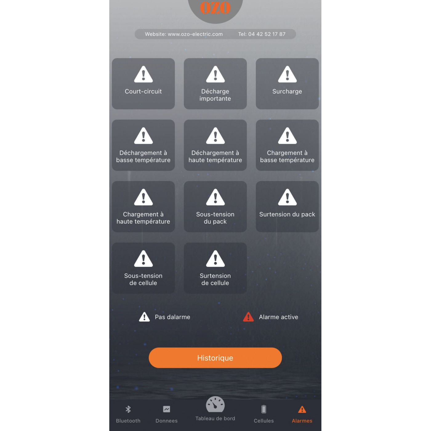 Après disparition du défaut, il reste sauvegardé dans l'onglet « Historique » accessible par le bouton du même nom dans cet onglet. En cas de défaut non lié à la température ambiante de la batterie, n'hésitez pas à nous contacter par mail en nous envoyer des captures d'écran des différents onglets à l'adresse batteries@ozo-electric.com