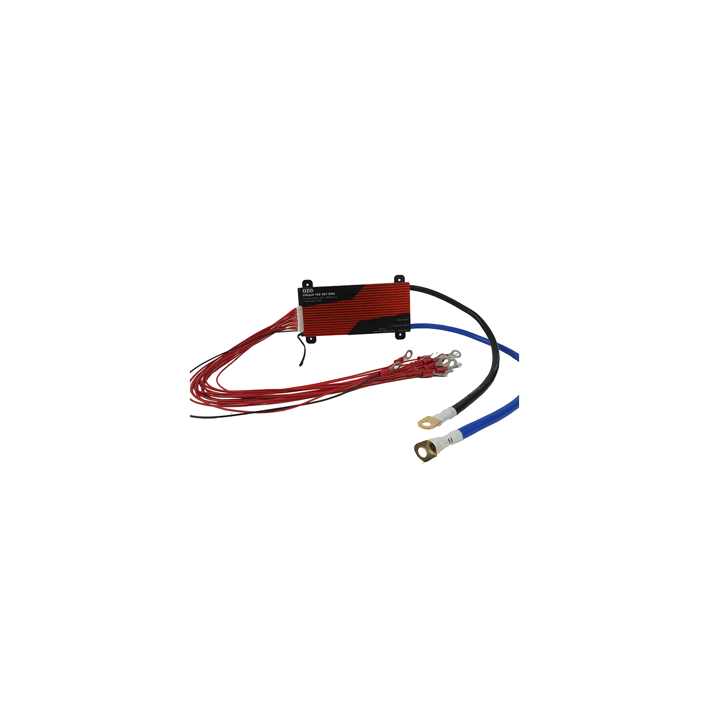 - 1 BMS 100A (Battery Management System) avec port de charge commun (34A max, caractéristiques max des cellules) , pour un courant de charge important cycle de charge et cycle de décharge indépendant. La batterie peut décharger ou recharger mais pas en même temps.