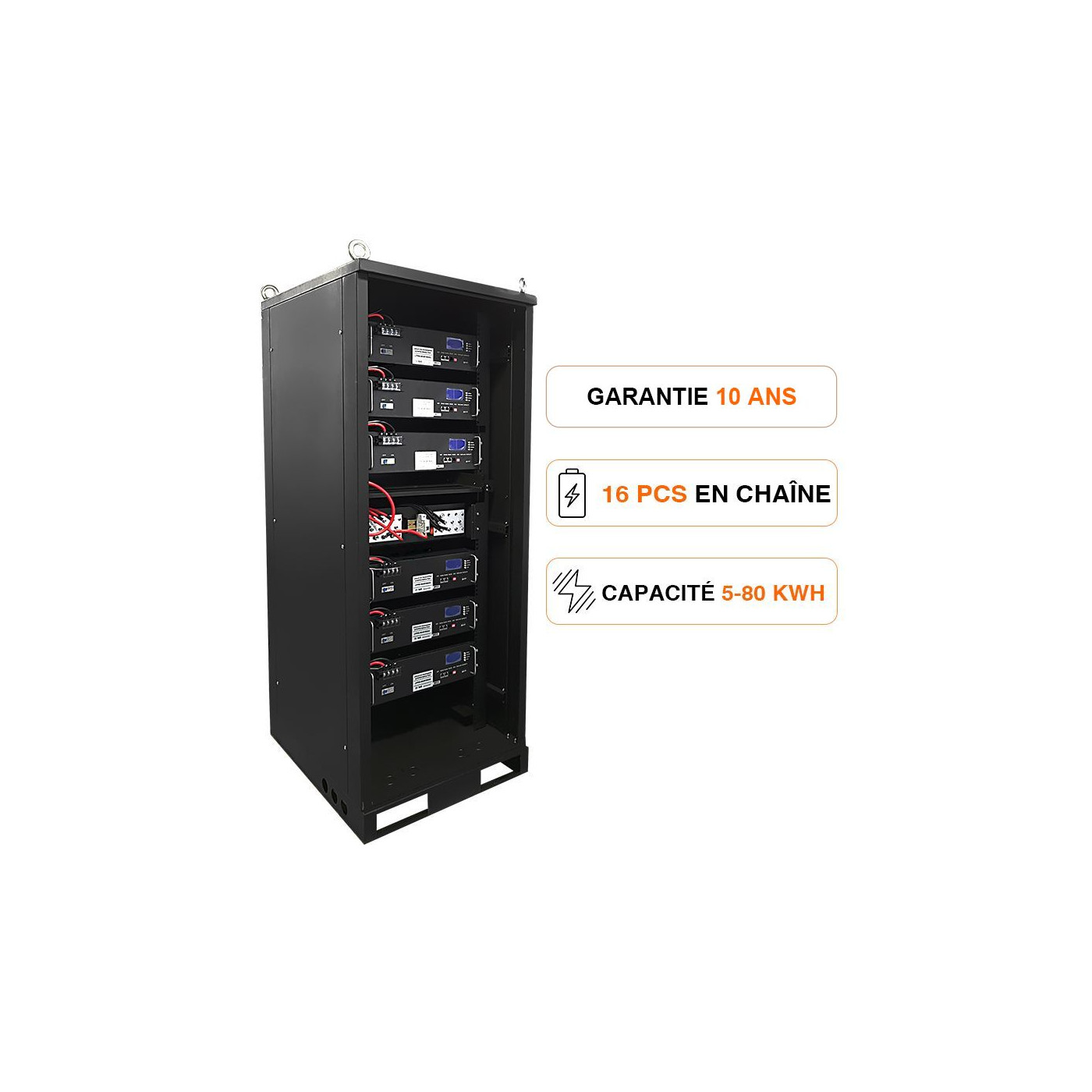 Son format rackable de seulement 50 kg, son installation simple en rack ou au mur, ainsi que son écran LCD intégré permettant le suivi du SOC, SOH, de la tension et de la température des cellules en font une solution modulaire et pratique.