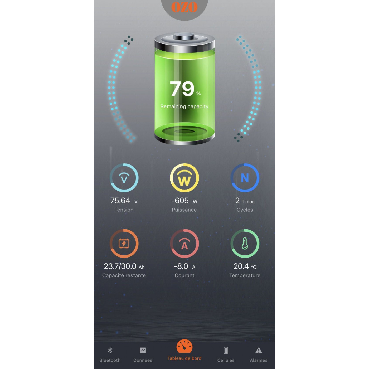 Grâce à l’application OZO Batteries, disponible sur Apple Store et Google Play Store, vous pouvez accéder en temps réel aux informations essentielles de votre batterie.