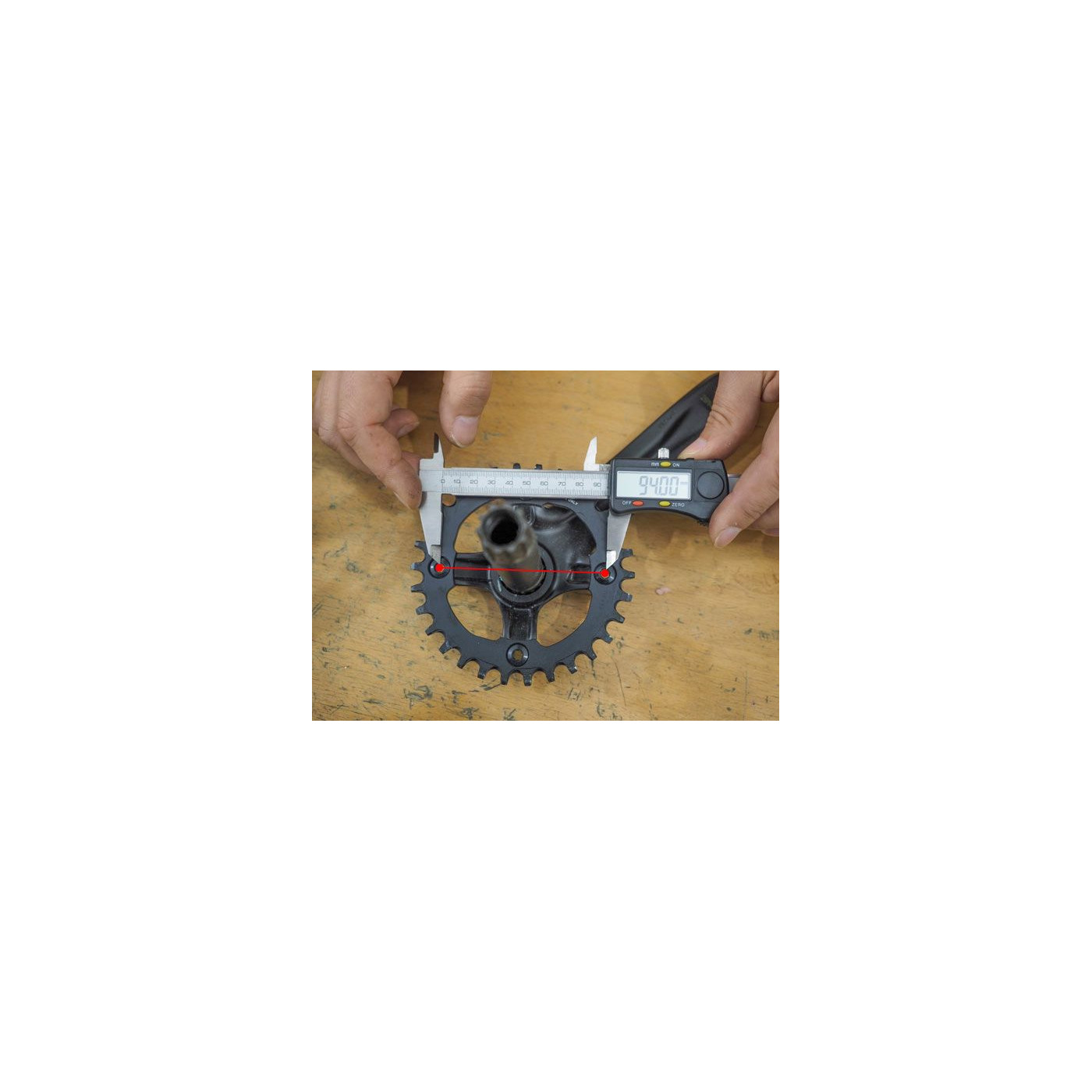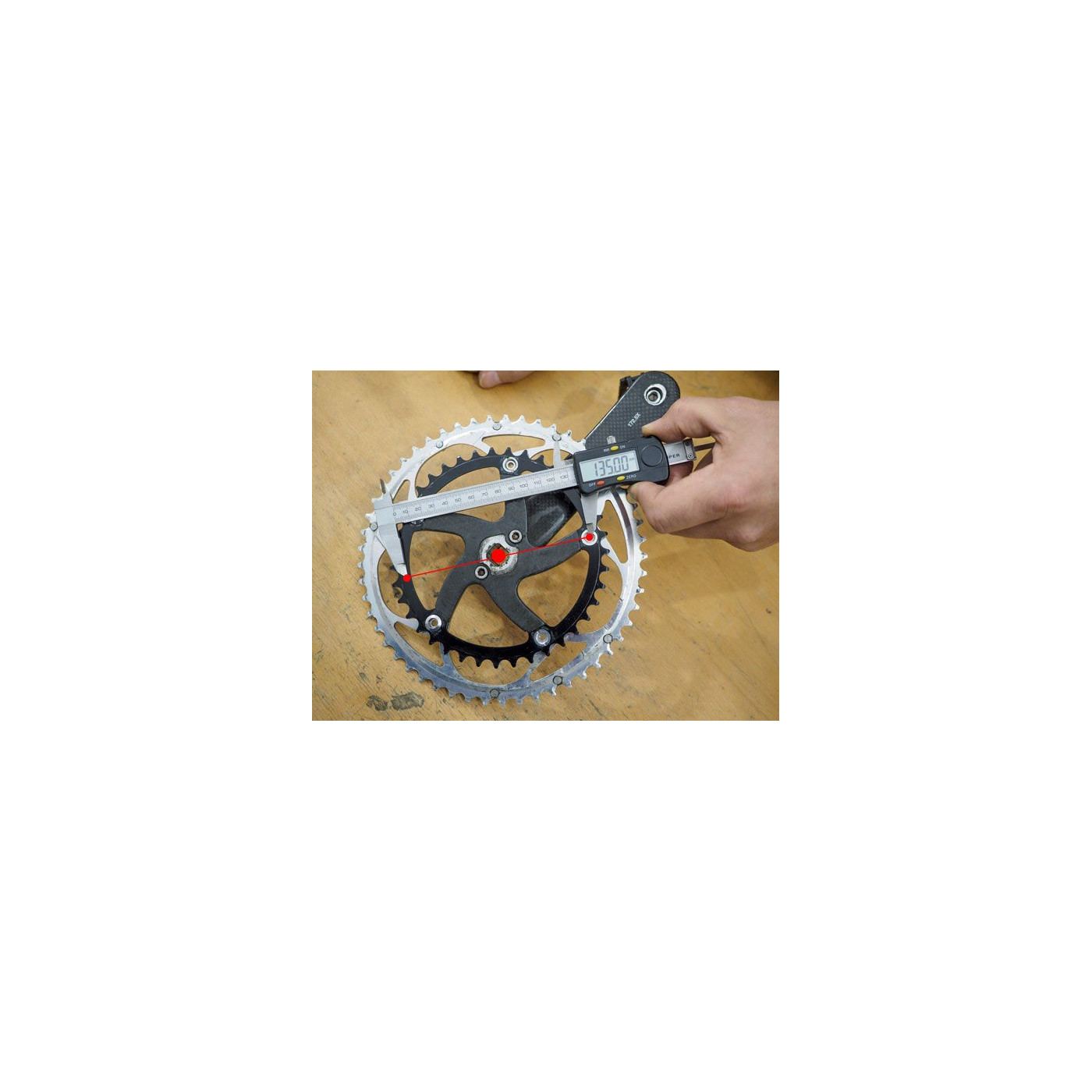 Comment mesurer l'entraxe de votre plateau 5 trous (correspond au diamètre du cercle dessiné par les 5 vis cheminées) ?