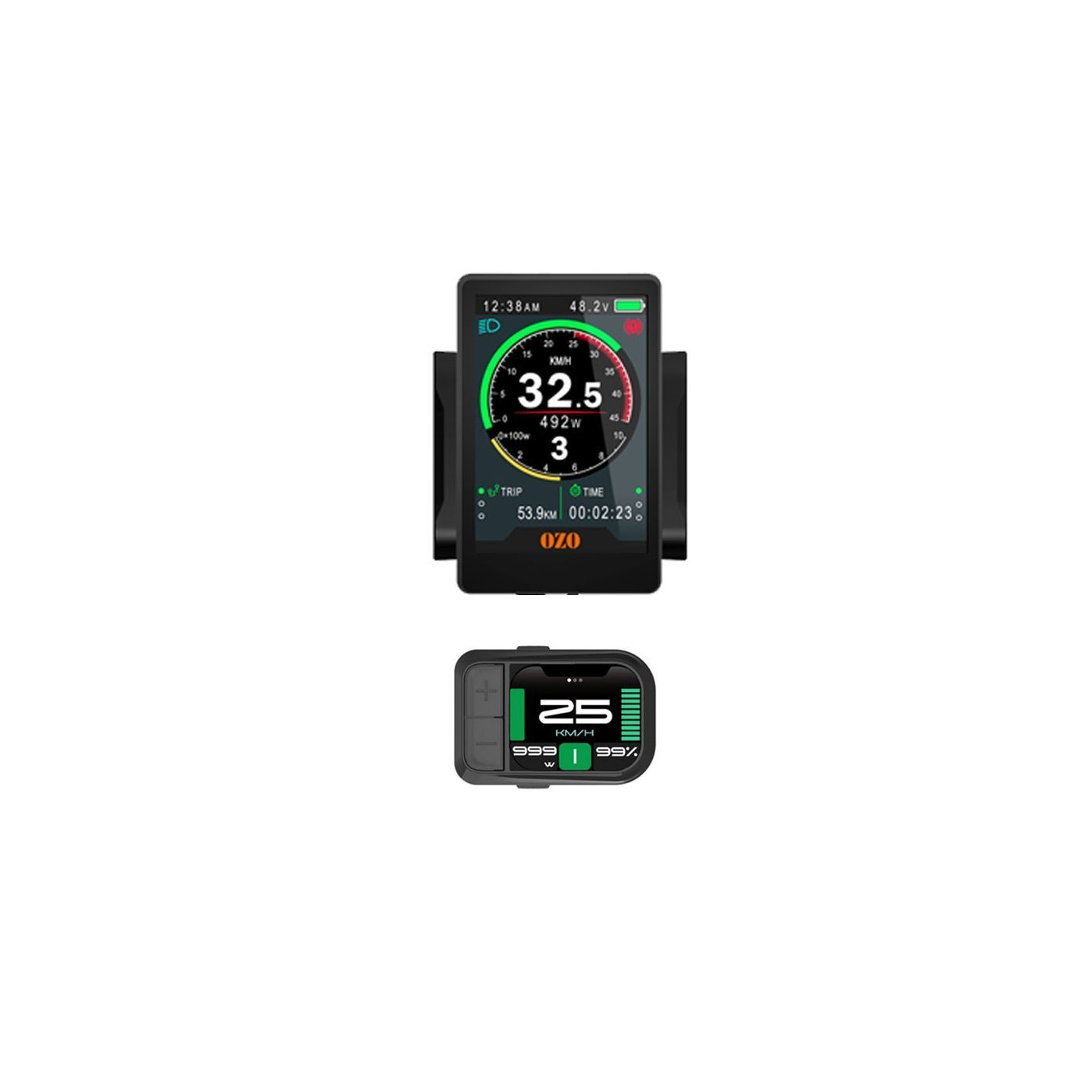 OZO vous propose de choisir parmi deux modèles de displays en fonction du budget et des fonctionnalités souhaitées. Le display est l'écran qui se trouve au guidon de votre vélo. Il vous affiche les paramètres électriques comme l'autonomie batterie, le niveau de puissance sélectionné et les paramètres trajets comme la distance ou la vitesse.