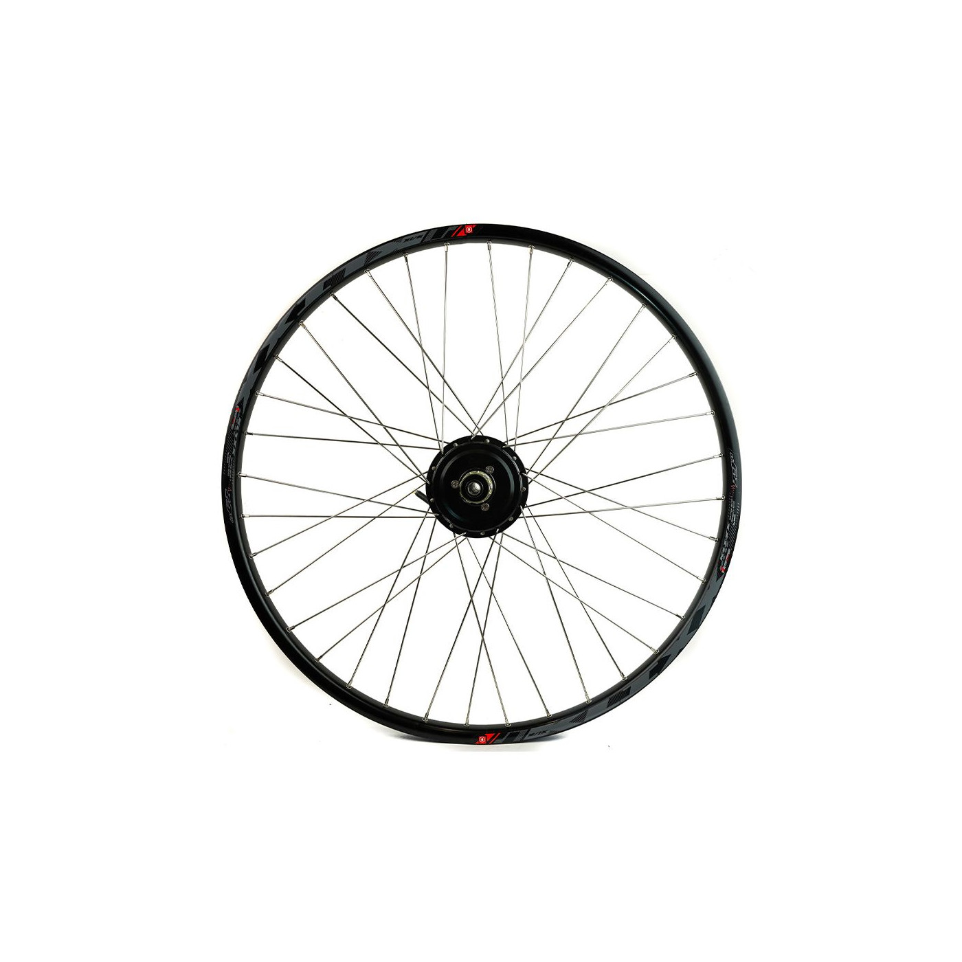 UNE ROUE MOTORISÉEUne roue rayonnée à la main avec un moteur de 250W et des jantes et rayons de fabrication française. |