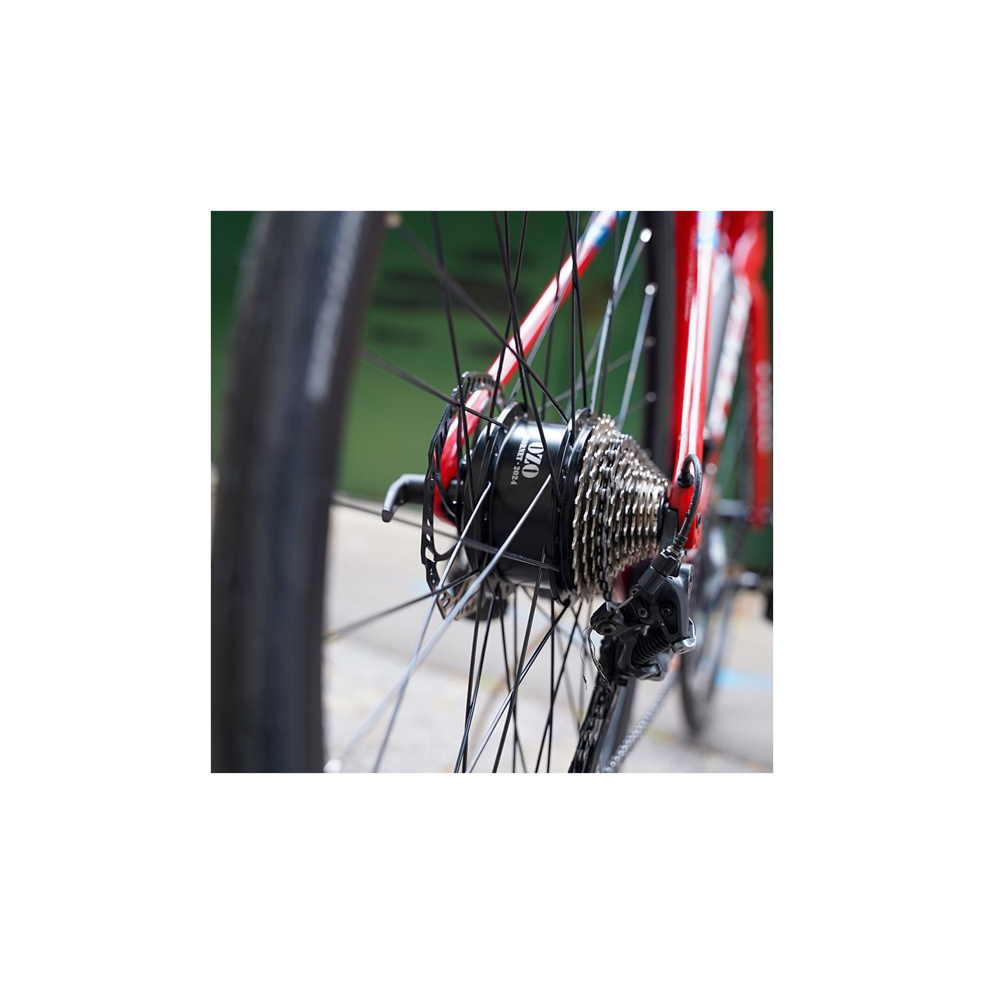 Spécifique aux vélos de route disposant d'un axe de roue arrière traversant 12x142mm, le moteur Hornet pèse seulement 1.7kg. Ici proposé avec un rayonnage sur une jante adaptée pour le vélo de route et le Gravel.