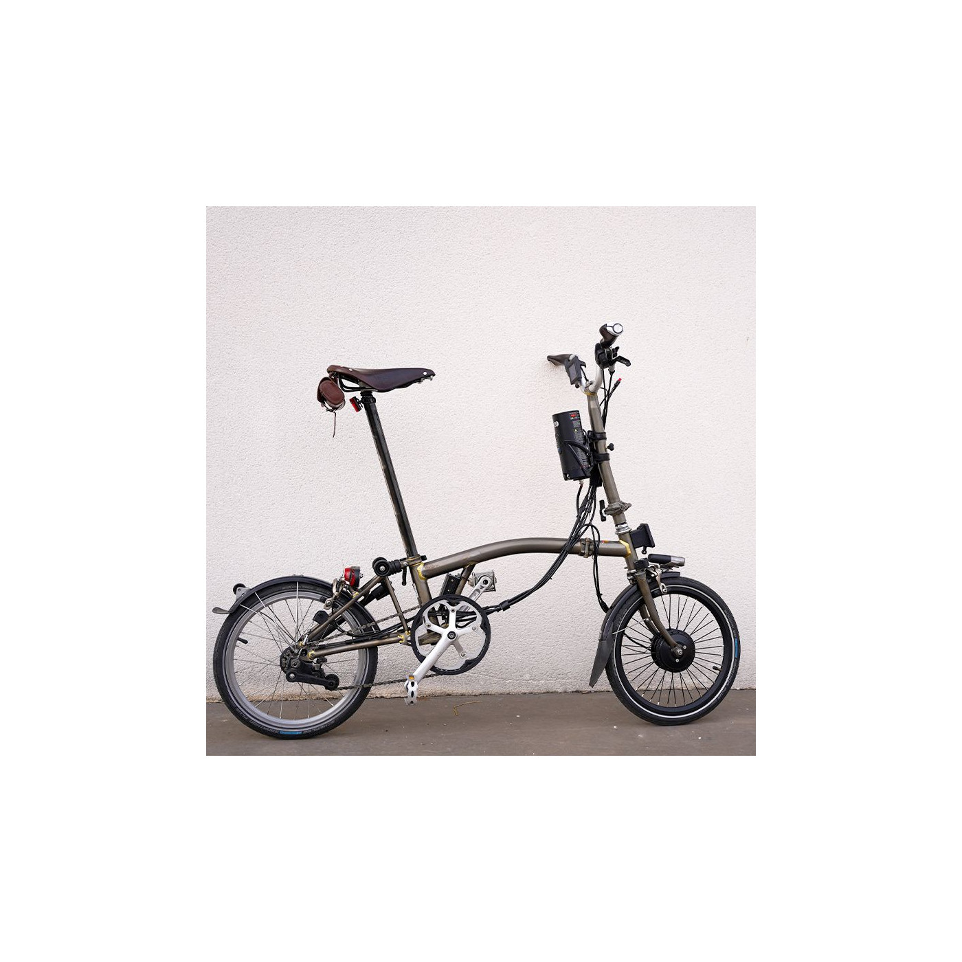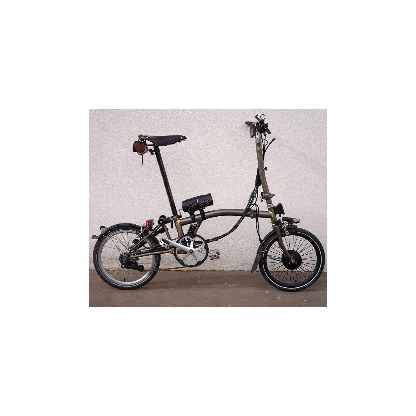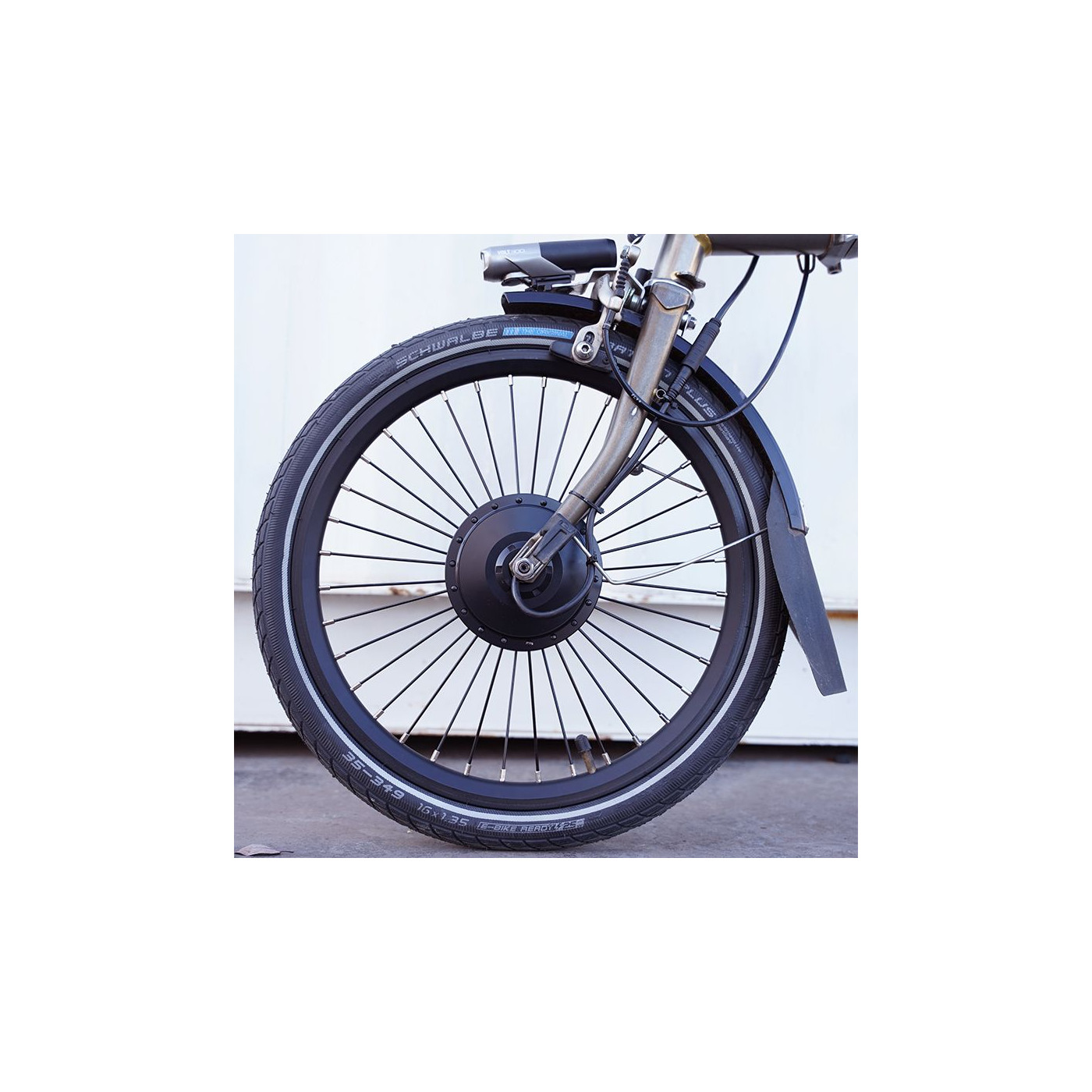 Une roue complète, entièrement noire, s'intègre parfaitement au vélo Brompton, avec une jante de 16 pouces 3/8 conforme à la configuration originale de Brompton. Moteur intérieur de 6 kW.