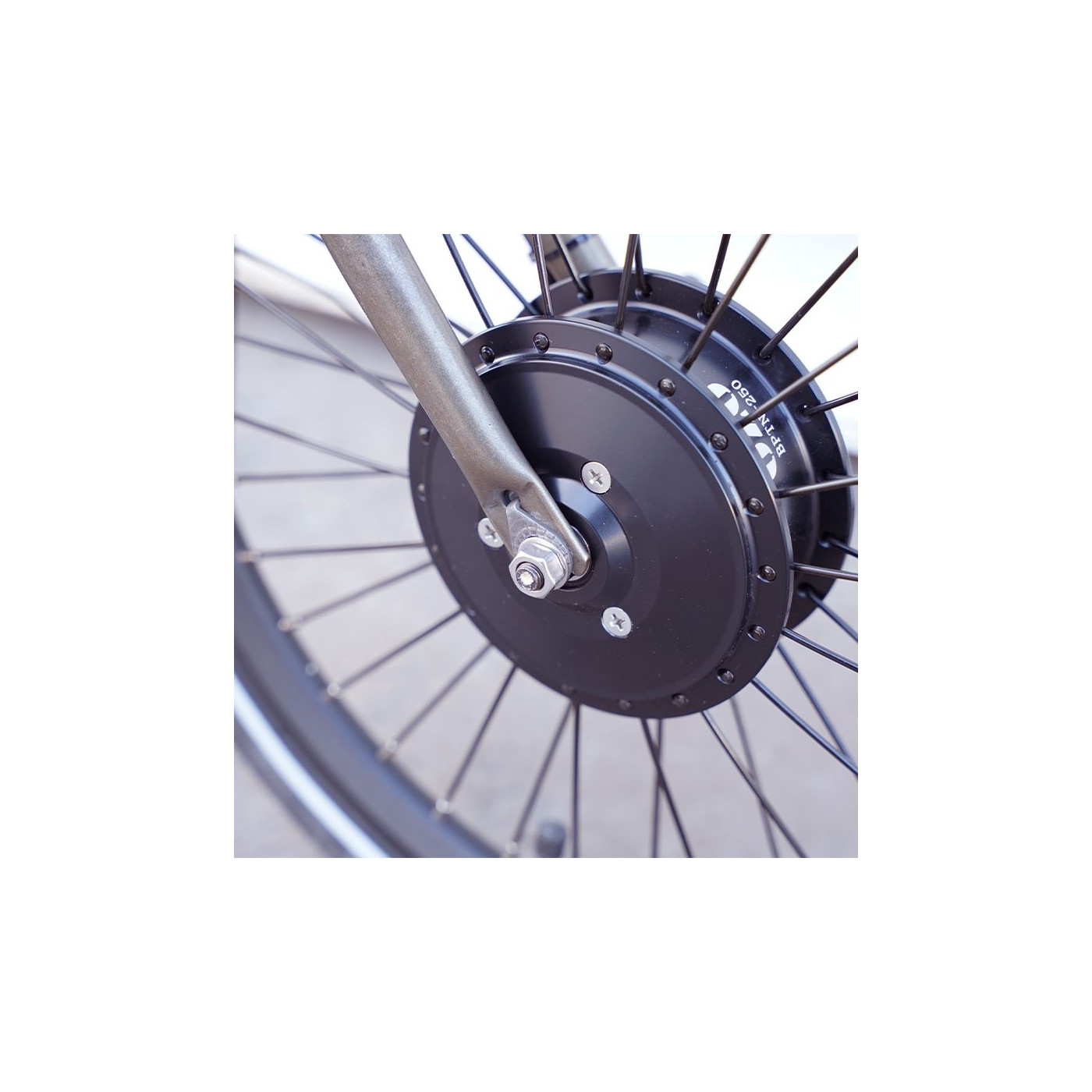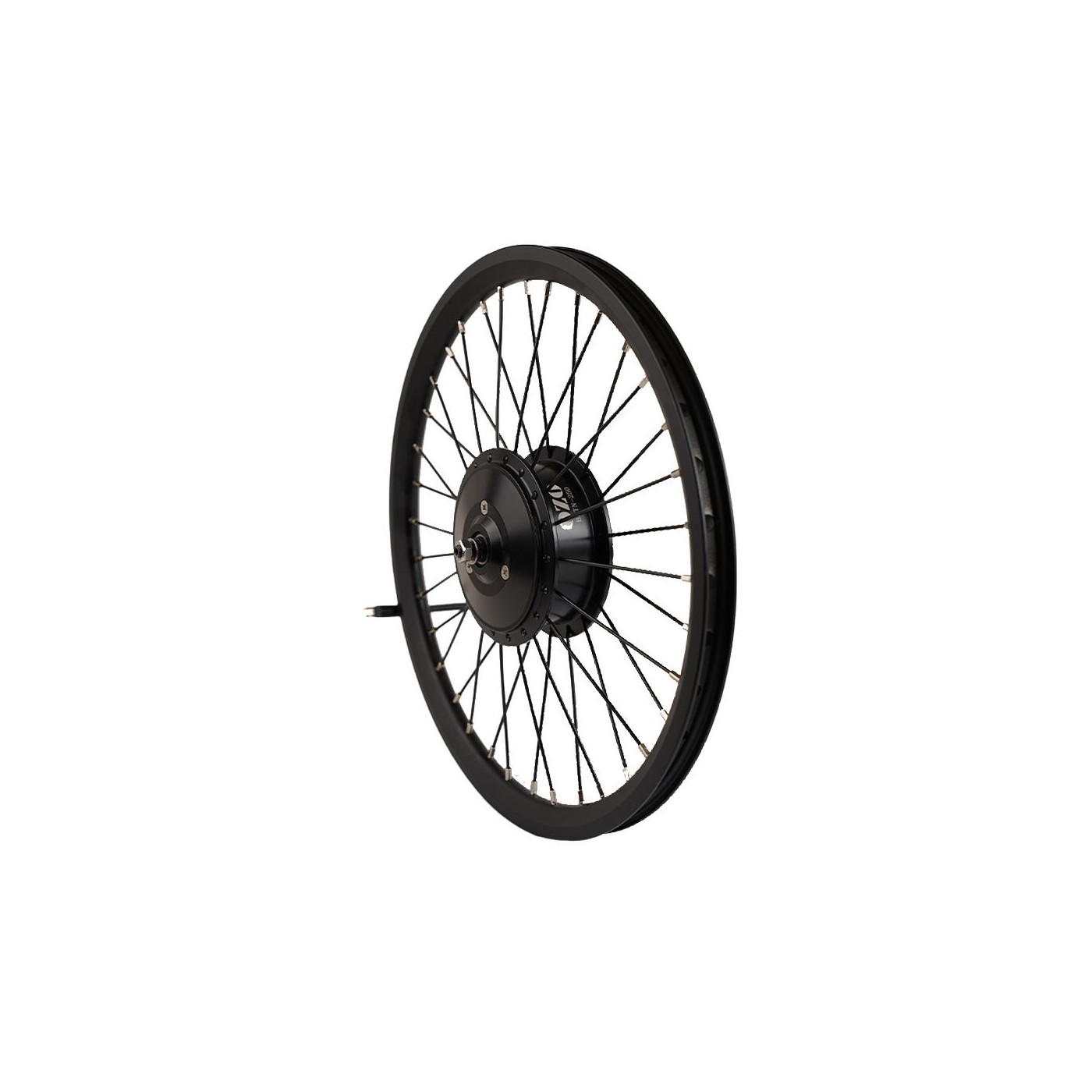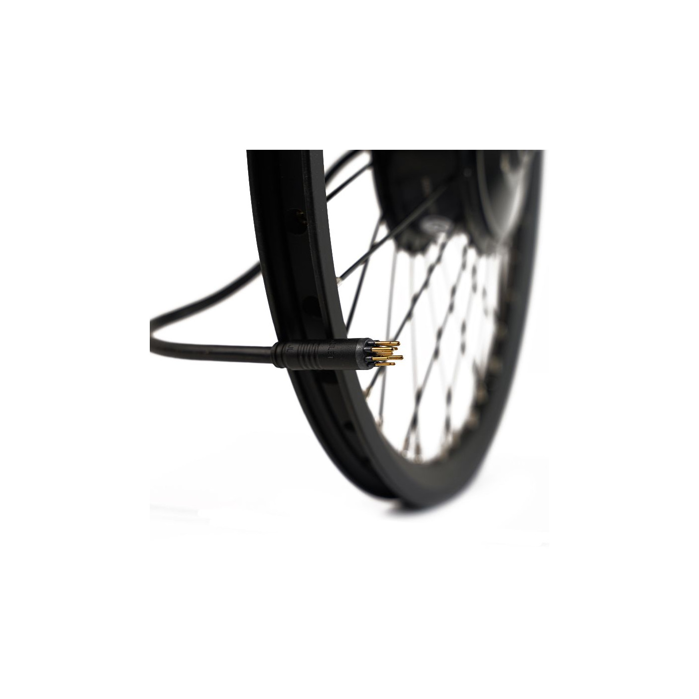 Une roue complète, entièrement noire, s'intègre parfaitement au vélo Brompton, avec une jante de 16 pouces 3/8 conforme à la configuration originale de Brompton. Moteur intérieur de 6 kW.