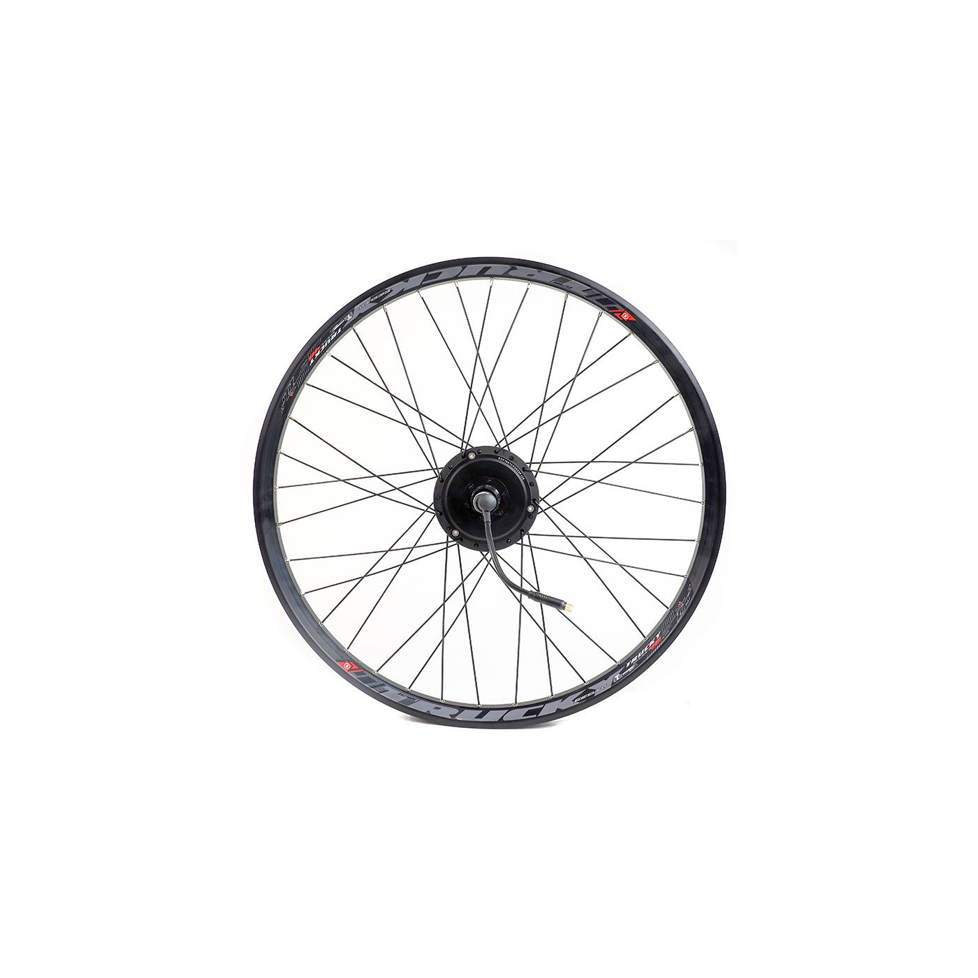 Une roue rayonnée à la main avec un moteur de 250W et des jantes et rayons de fabrication française.
