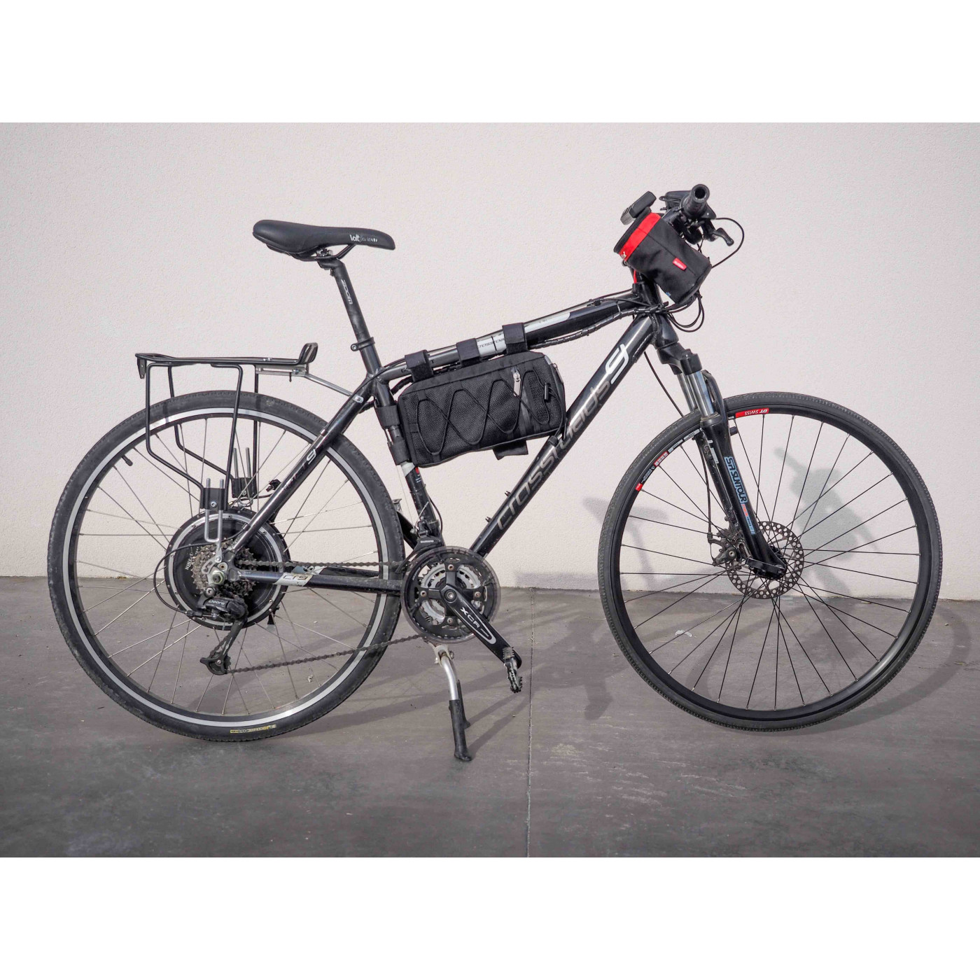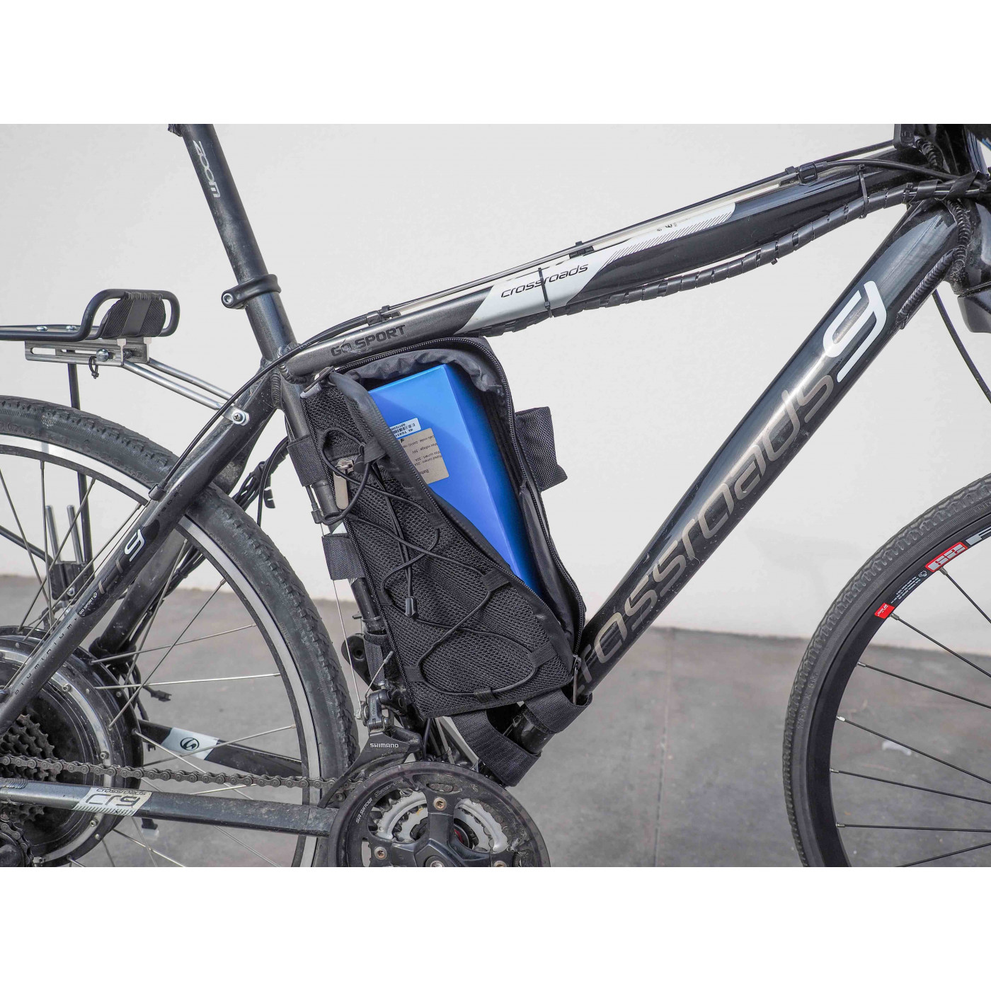 Elle peut être fixée sur le cadre à la verticale ou à l'horizontale ou sur le porte bagages