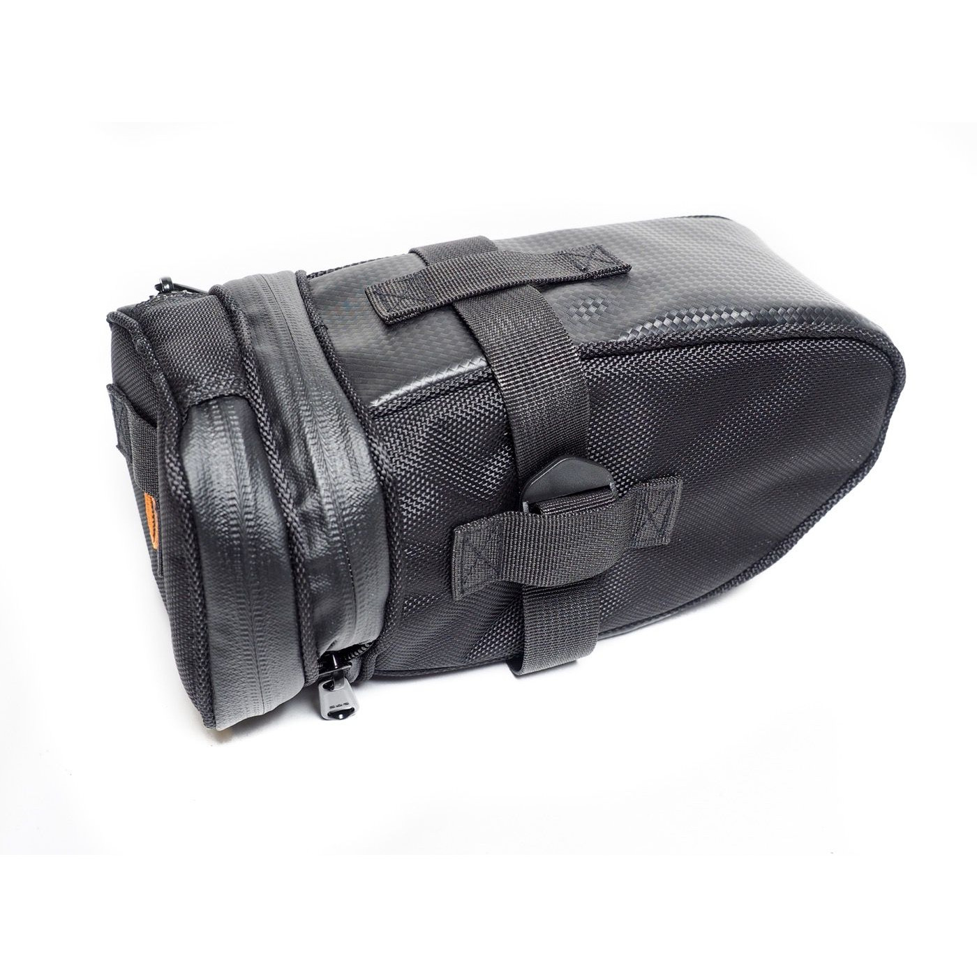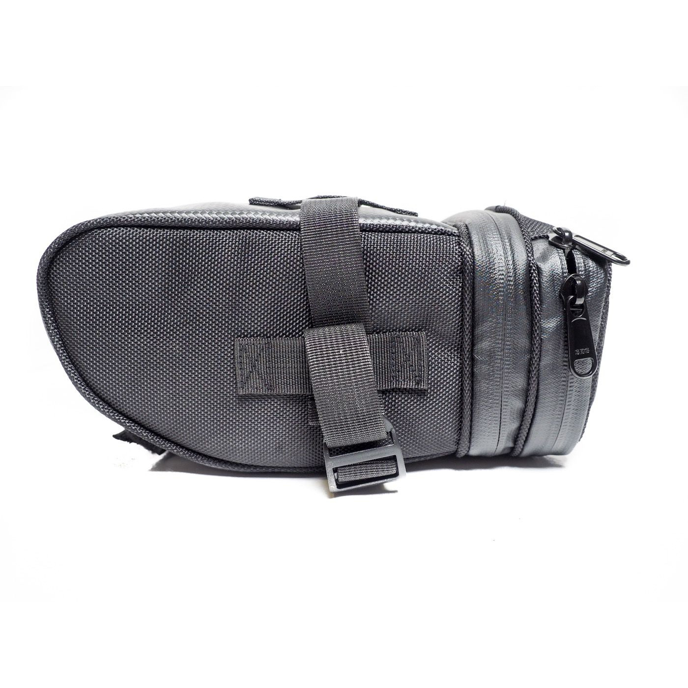 La fermeture éclaire positionnée sur l’arrière de la sacoche, permet d’agrandir celle ci grâce à un soufflet .En position fermé on peut y loger une petite batterie 36V 9Ah et une fois le soufflet ouvert on peut y installer une plus grande batterie jusqu’à 48V 14 Ah .